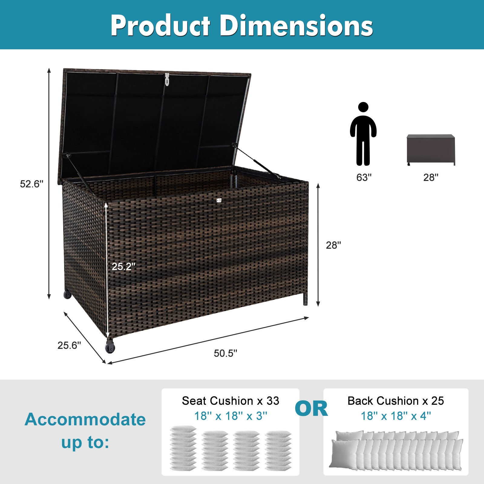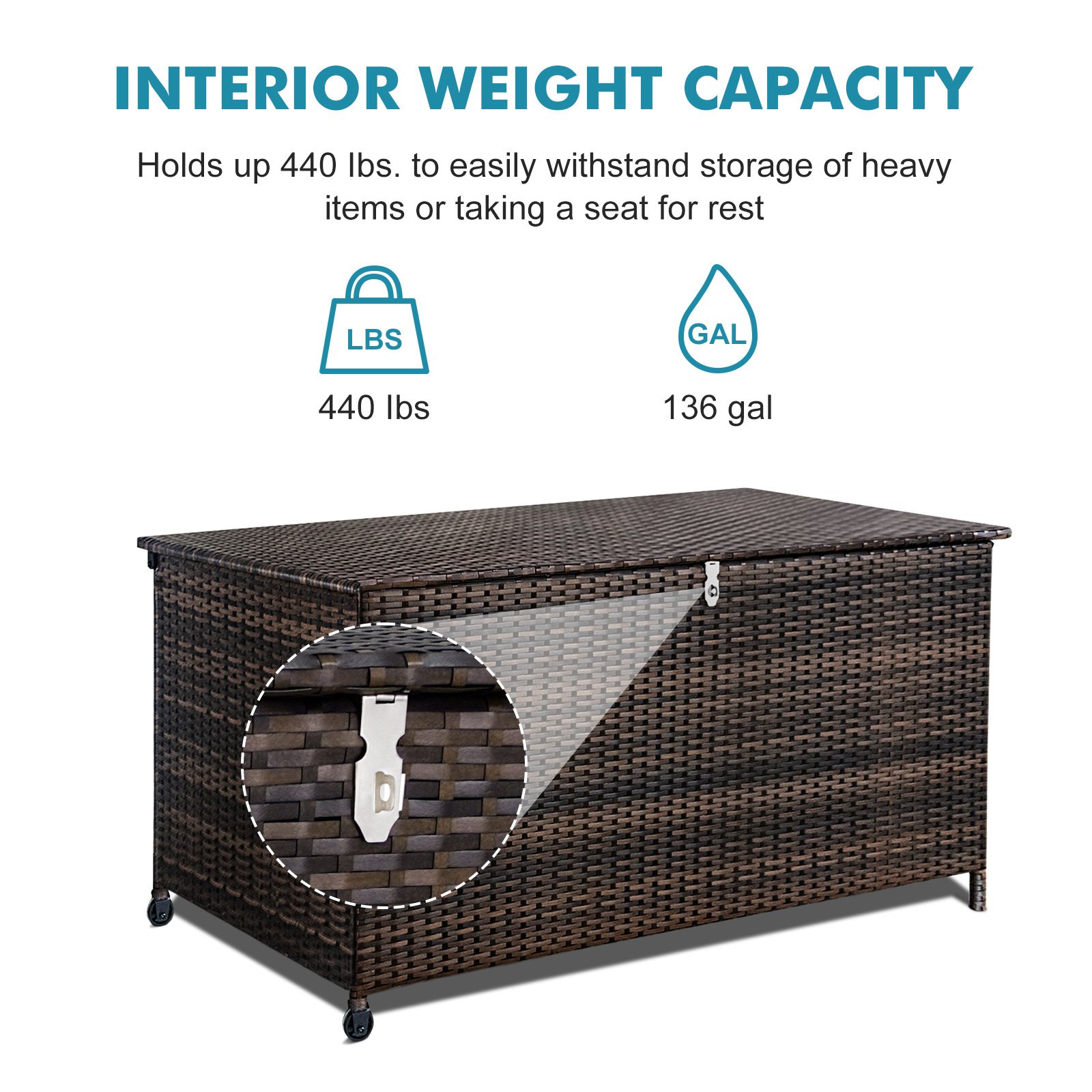 This 120 Gal. large-capacity outdoor wicker storage bin is a wonderful choice for people who like to stay organized. Use it to tidy the contents of your porch or patio. You might like to use it to store the coasters your guests will use to consume beverages outside on warm sunny days. With a full-coverage plastic lid deck, the contents of this outdoor storage bin will be protected from the elements. It is UV resistant and made with resin wicker to provide the utmost durability. A pneumatic hinge supports for smooth opening and closing, so this bin won't creak when you open and close it. Quickly assemble Resin Deck Box with no tools needed. Outdoor storage bench is perfect to store outdoor patio furniture cushions, outdoor toys, pool accessories and beach towels.