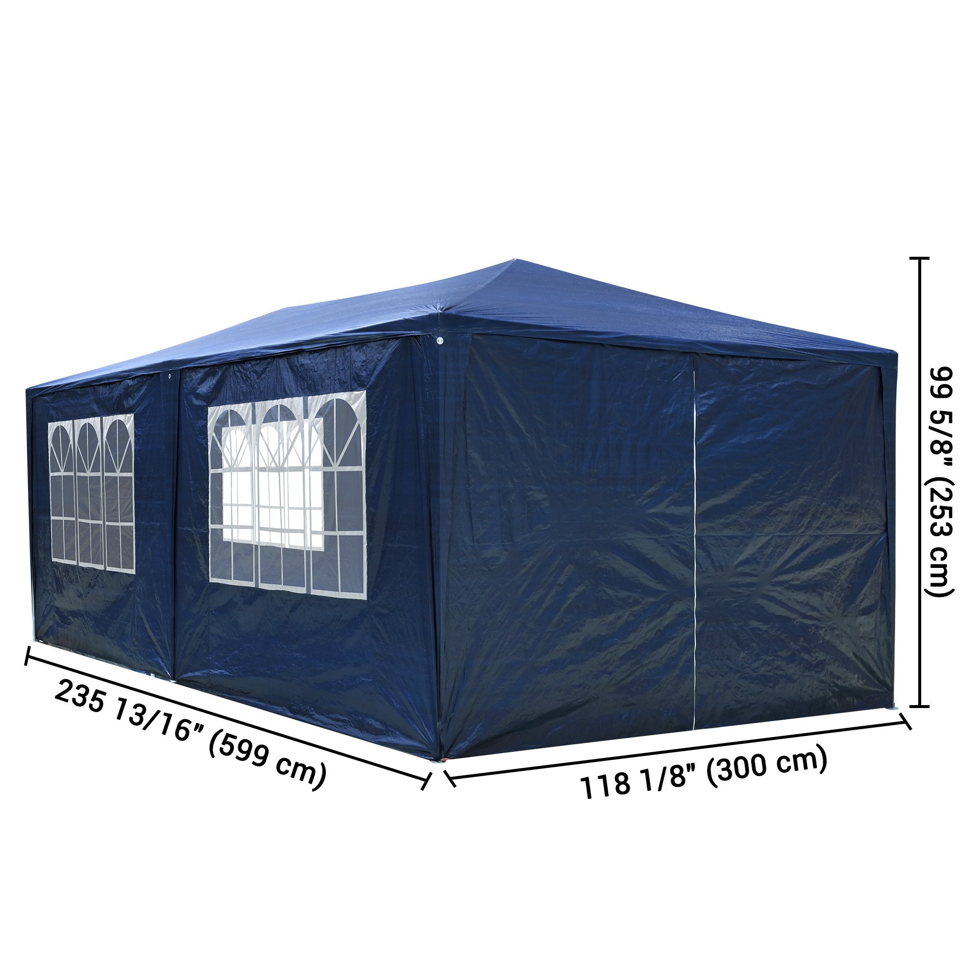 - Overall Dimension(LxWxH): 10 x 20 x 8 1/6 ft (3 x 6 x 2.5 m) - Sidewall Size(LxH): 10 x 6 7/12 ft (3 x 2 m) - Frame Material: White Powder Coated Steel /w PE Joint Fittings - Net Weight: 19.8 Lbs (9 kg)