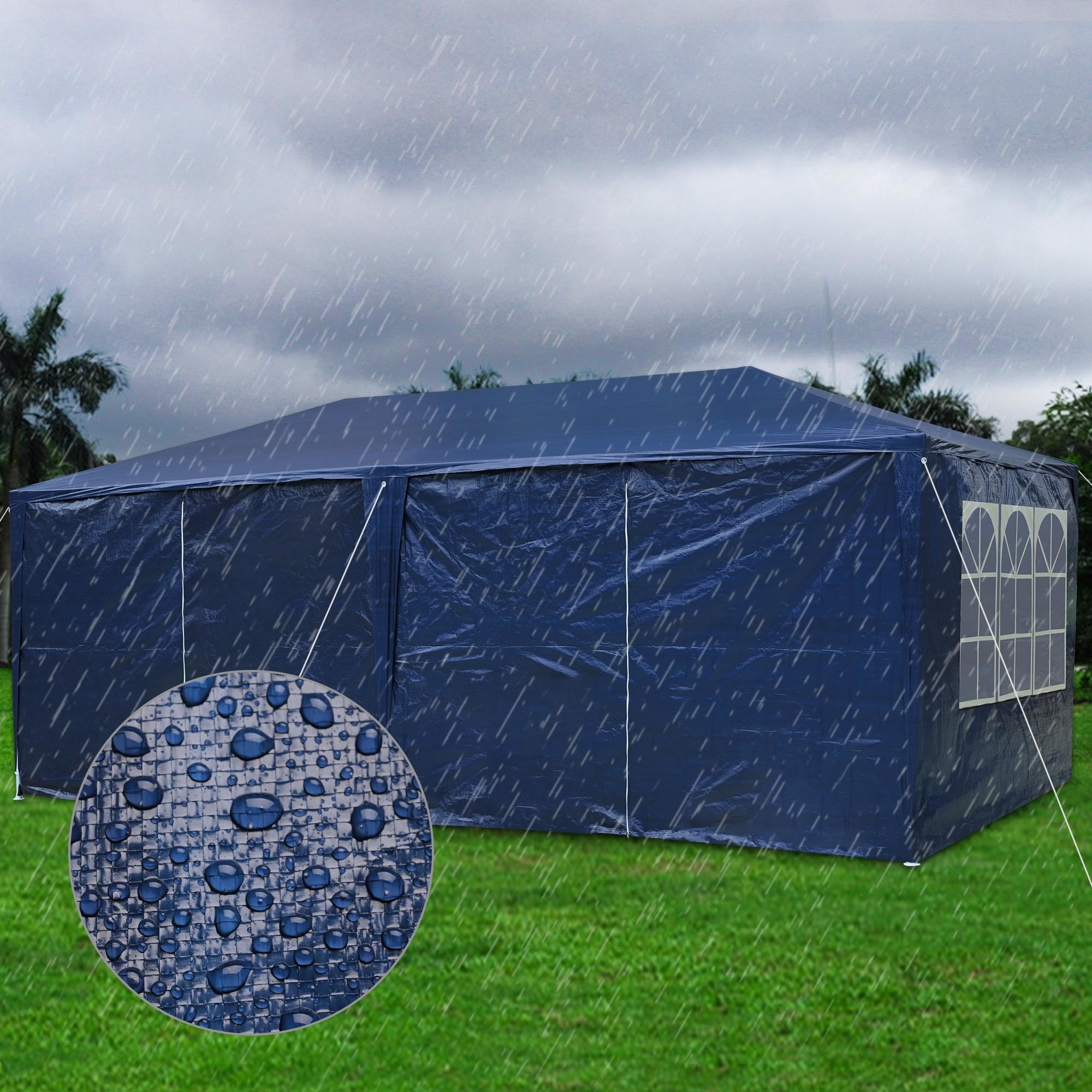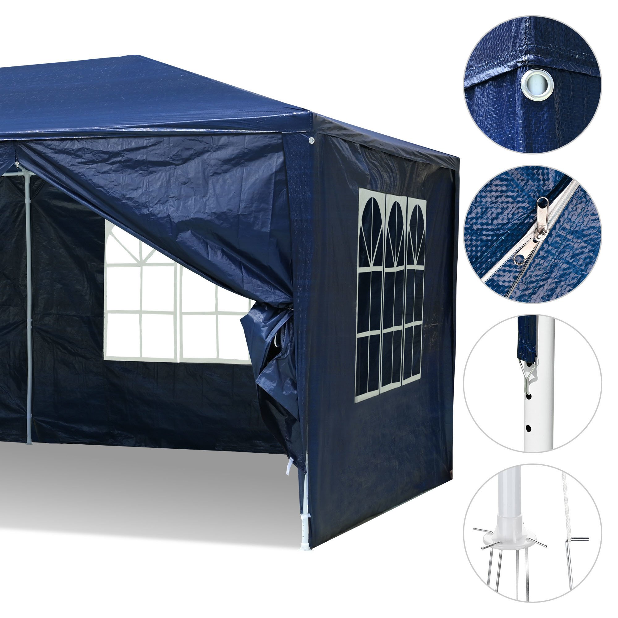 - Detachable Sidewalls - 6 sidewalls with hook & loop fastener for easy attaching and removal according to your need; 4 sidewalls with transparent church window to let in plenty of natural light & provide clear landscape views; zipper door for easy access & good ventilation on hot days - Easy to Assemble & Store - No tools required for easy assembly and disassembly; Lightweight tubes can be completely detached and conveniently stored into your car truck - Durable Material - Tent roof & sidewalls are made of water-resistant & UV-resistant PE; ideal for outdoor use; Metal frame with rust-resistant powder coating for durability; Corner joints and baseboards made of brand-new PE won't get brittle easily for long lifespan - Ground Stakes for Stability - Baseboard with holes for inserting stakes to ensure stability when using on the lawn; suitable for using with sand bags (not included) to add extra stability