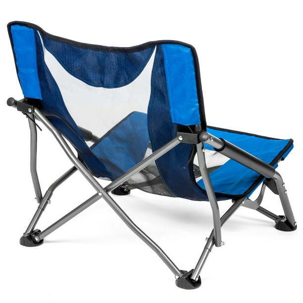 Compact Low Profile Outdoor Folding Camp Chair Features:Comfortable - With breathable mesh fabric and cushioned armrests.Compact - Just 21" high and 20" wide, meeting requirements for most outdoor music festivals. Sits 9" off the ground. Folds up fast and stows easily at 26" x 8" into an included storage bag with shoulder strap, carrying weight is 7 lbs.Capable - Strong steel and aluminum frame holds up to 250 lbs.Versatile - The perfect low profile, lightweight chair for camping, the beach, outdoor concerts, sporting events, and much more.Perfect for kids and adults alike!Color – Royal Blue