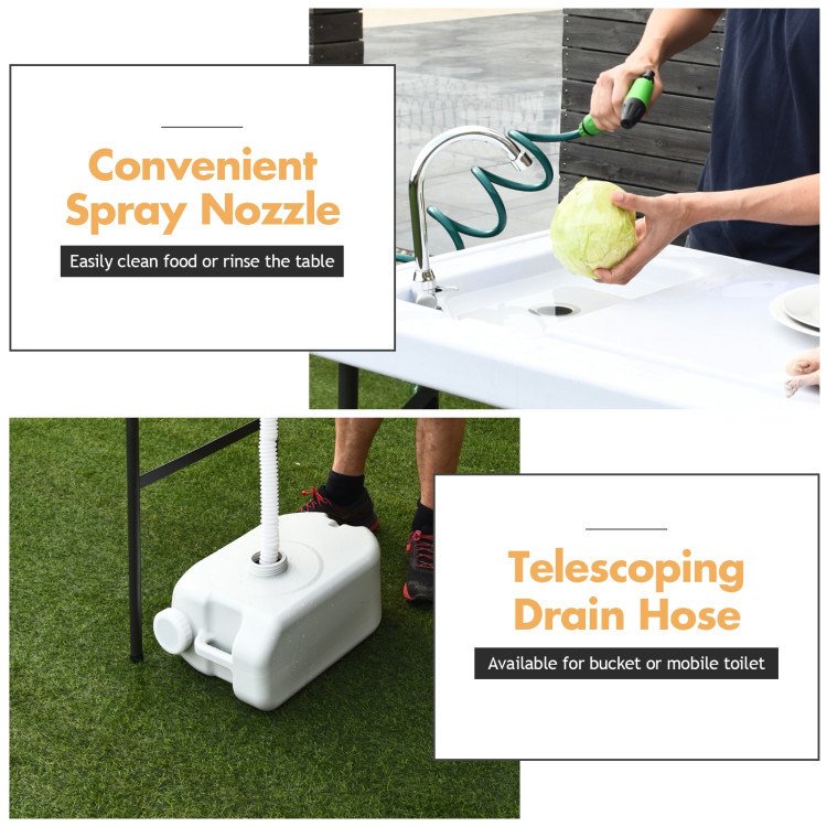 The quick-connect faucet is simple to set up and attach to a garden hose; & the extending sprayer gives you water pressure where you need it. With a durable sloped surface and integrated sink with drain; this table gives you the convenience of your kitchen in the great outdoors. The folding legs allow you to take this table anywhere.