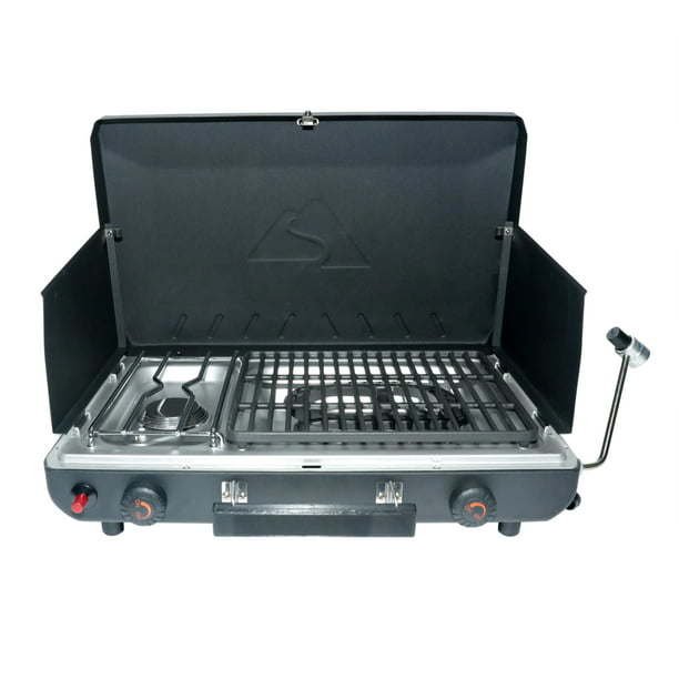 Cook and grill simultaneously with the Ozark Trail 2-in-1 Portable 2 Burner Propane Camp Stove Grill. Push-button ignition system for matchless lighting, you'll be cooking with up to 20,000 total BTUs. The stove surface fits a 6-inch pot and the 122-square-inch grill area leaves plenty of room for grilling. Durable steel body with wind guards help shield your flame from wind. All of this in one compact design that sets up easily at the campsite, tailgate, or in your backyard. 2-in-1 design so you can use the grill and stove at the same time. 2 adjustable burners for precise temperature control. Once the grilling is done and the grill cools down cleanup is easy with a removable grease management tray for easy cleaning. The grills handle aid in portability and final storage until your next event.